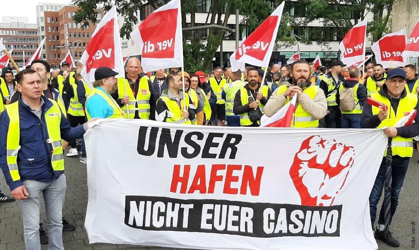 vergangenen Jahr. Die HHLA betreibt drei der vier Containerterminals im Hamburger Hafen. Beinahe die Hälfte des Seehafenumschlags Deutschlands entfällt auf den Hafen der Hansestadt. Angesichts dessen hat diese Privatisierung bundesweite Bedeutung. Die öffentliche Hand droht die Kontrolle über das Unternehmen (und damit letztlich die Hafenlogistik) zu verlieren. Private Profitinteressen gewinnen dann an Bedeutung, der Einfluss demokratisch gewählter Vertreterinnen und Vertreter schrumpft. Die Beschäftigten der HHLA befürchten zudem eine Verschlechterung ihrer Arbeitsbedingungen und den Verlust von Arbeitsplätzen. Für ver.di ist klar: Der Ausverkauf der HHLA muss gestoppt werden! Wir brauchen einen starken demokratischen Einfluss auf wichtige öffentliche Infrastrukturen – und zu denen gehören auch die Seehäfen. Die Beschäftigten demonstrieren deshalb seit Monaten zu Recht unter dem Motto: