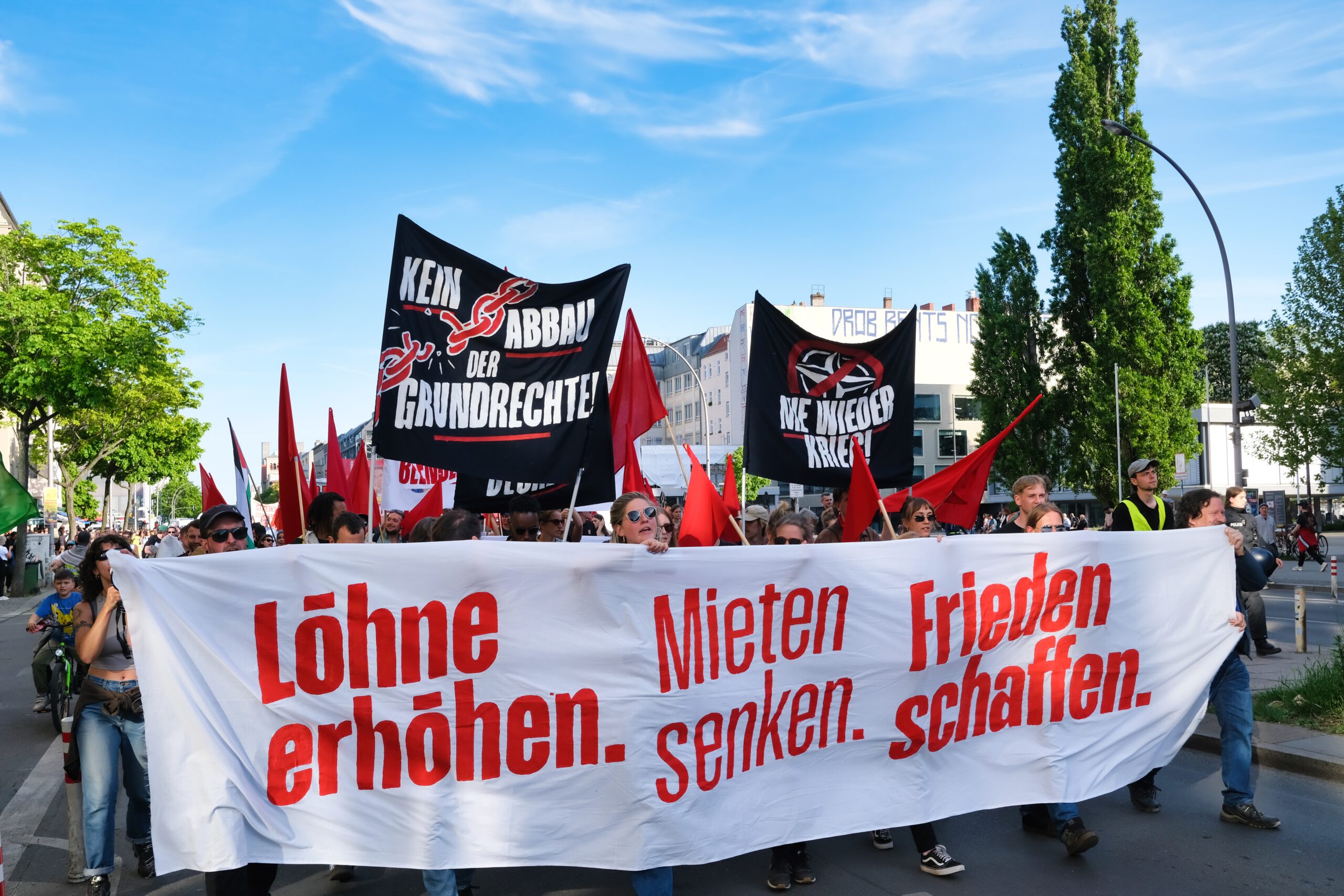 Mit Slogans wie „Hoch mit den Löhnen, runter mit der Miete!„, „100 Milliarden – Für Bildung und Gesundheit!“ und „Soziale Sicherheit – Statt Aufrüstung!“ wurde gegen den sozialen Kahlschlag, die rasant zunehmende Militarisierung sowie die desolate Wohnraumpolitik des Berliner Senats protestiert.