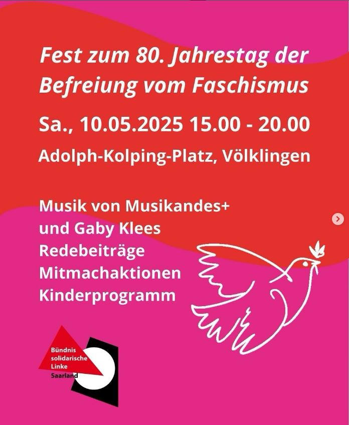Das Bündnis solidarische Linke Saar lädt gemeinsam mit Unterstützung des Integrationsbeirats der Stadt Völklingen sowie weiteren lokalen und saarländischen antifaschistischen Gruppen und Friedensinitiativen, alle Bürgerinnen und Bürger, auch Kinder, Jugendliche und Familien ein, mitzufeiern.