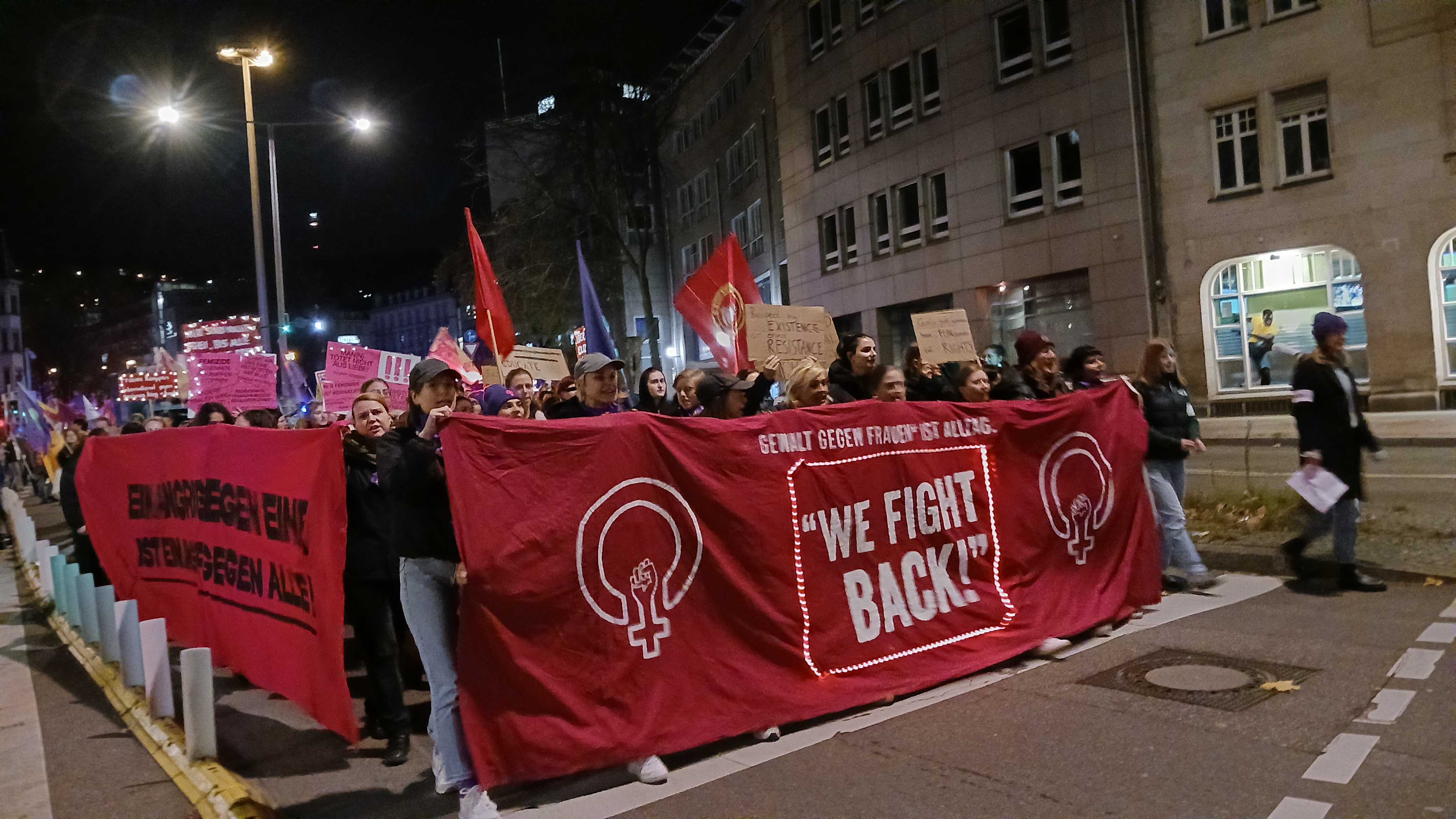 Im Aufruf für die diesjährige Demonstration am 25. November schreibt das Stuttgarter Aktionsbündnis 8. März: „Das Geld, das im sozialen Bereich gespart wird, fließt stattdessen in Militarisierung und Kriege weltweit und verursacht so noch mehr Gewalt und Leid. Auch die Rechtsentwicklung trägt dazu bei, dass sich die Situation immer weiter verschärft. Kollektiv erkämpfte Errungenschaften werden Ziel antifeministischer, queerfeindlicher und rassistischer Angriffe. (…) Patriarchale Gewalt ist keine Frage der Herkunft. Umso wütender macht uns, dass dieses falsche Narrativ dazu genutzt wird, rassistische Spaltung zu betreiben und die deutsche Abschottungs- und Abschiebepolitik zu legitimieren. Mit dieser rassistischen Hetze wird von der wahren Ursache der Gewalt abgelenkt: dem patriarchalen und kapitalistischen System (…) Am 25. November, dem internationalen Tag gegen Gewalt an Frauen, wollen wir alldem auf der Straße Ausdruck verleihen. Wir sind laut: gegen Femizide, gegen patriarchale Gewalt, gegen Sozialabbau, Militarisierung und Rechtsruck – für ein freies und selbstbestimmtes Leben.“