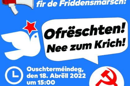 Unter dem Motto »Nee zum Krich!« rufen die »Friddensplattform« und der OGBL alle Bürgerinnen und Bürger und Vereinigungen zu einem »Friddensmarsch« an Ostermontag, dem 18. April 2022 um 15.00 Uhr auf....